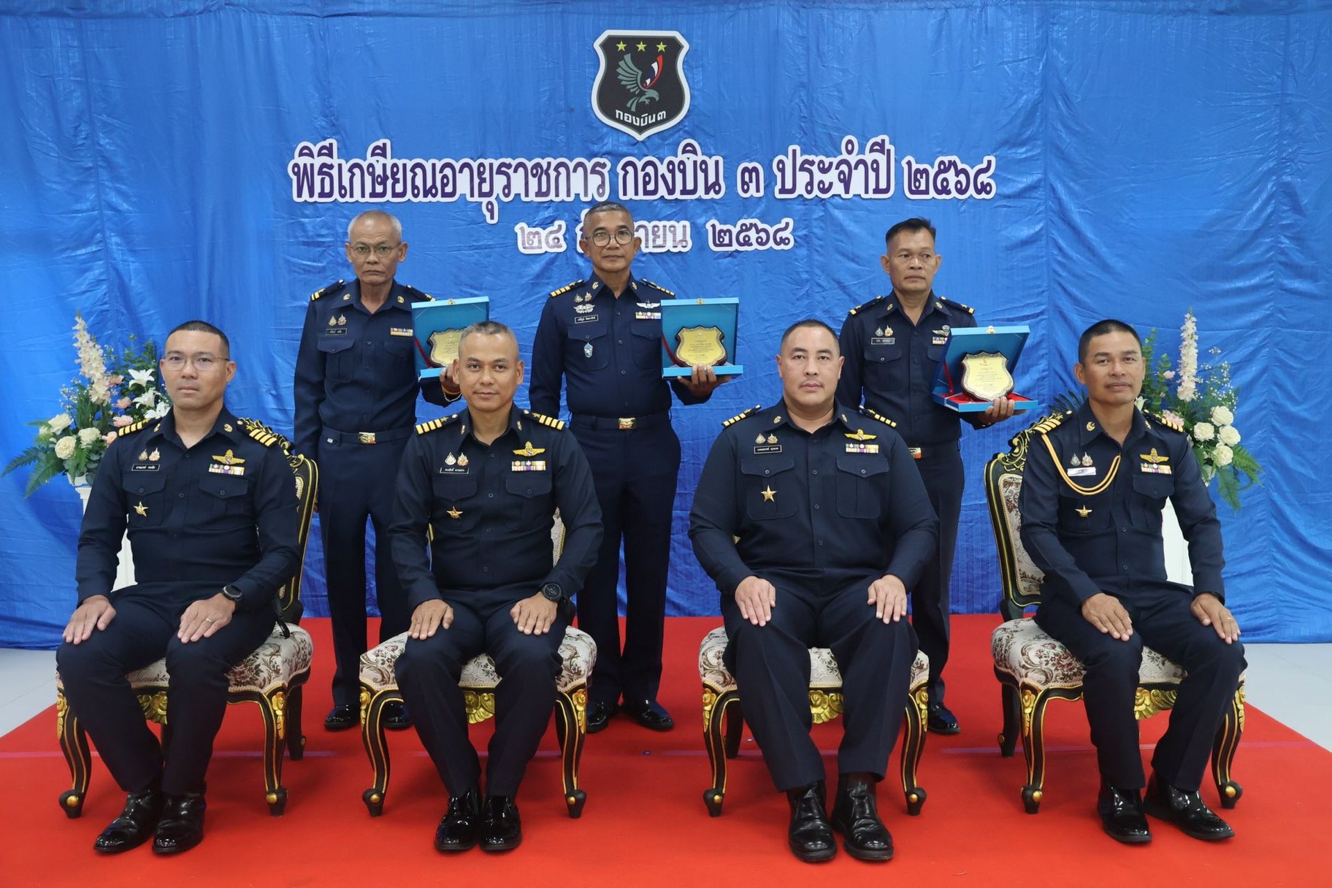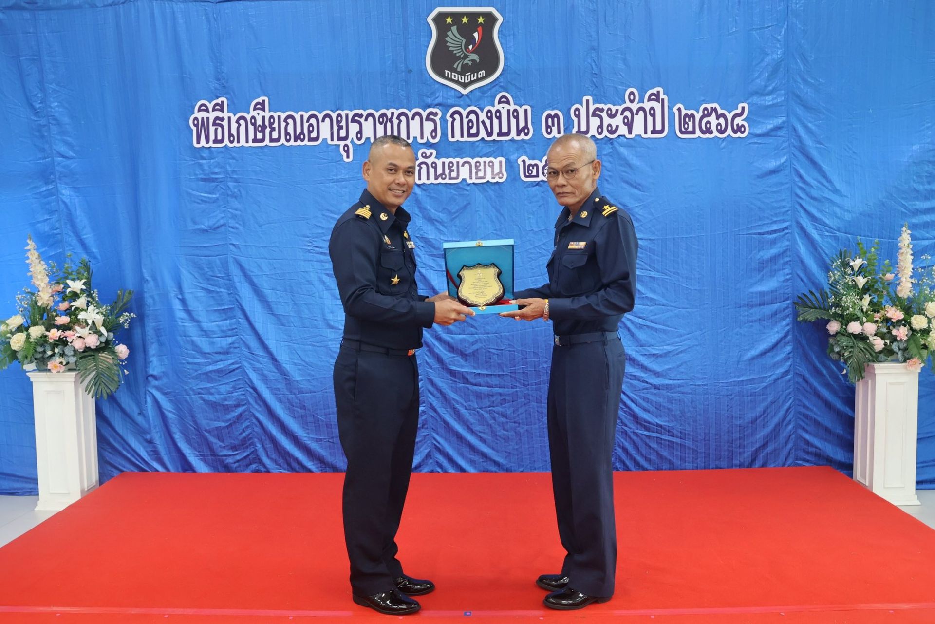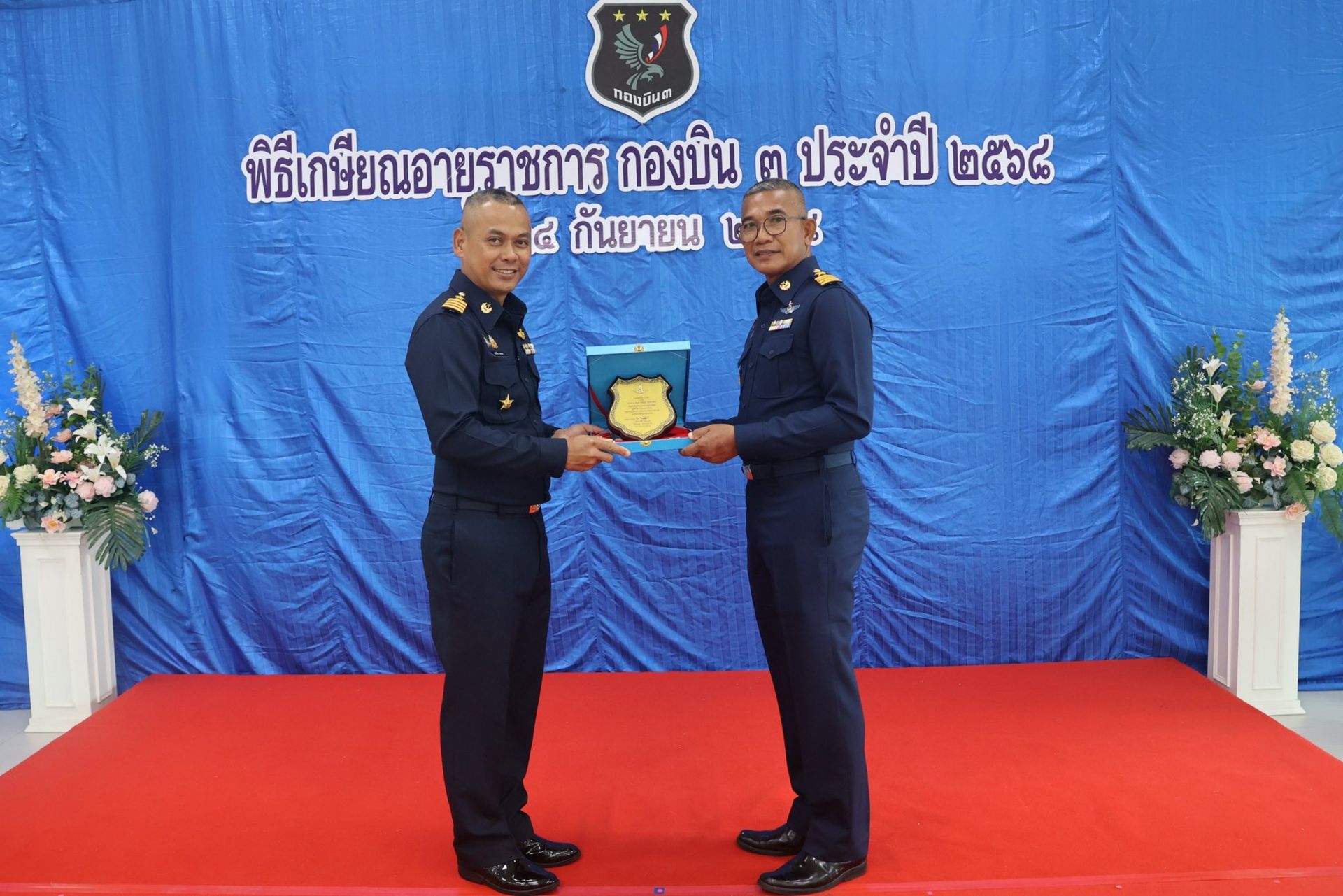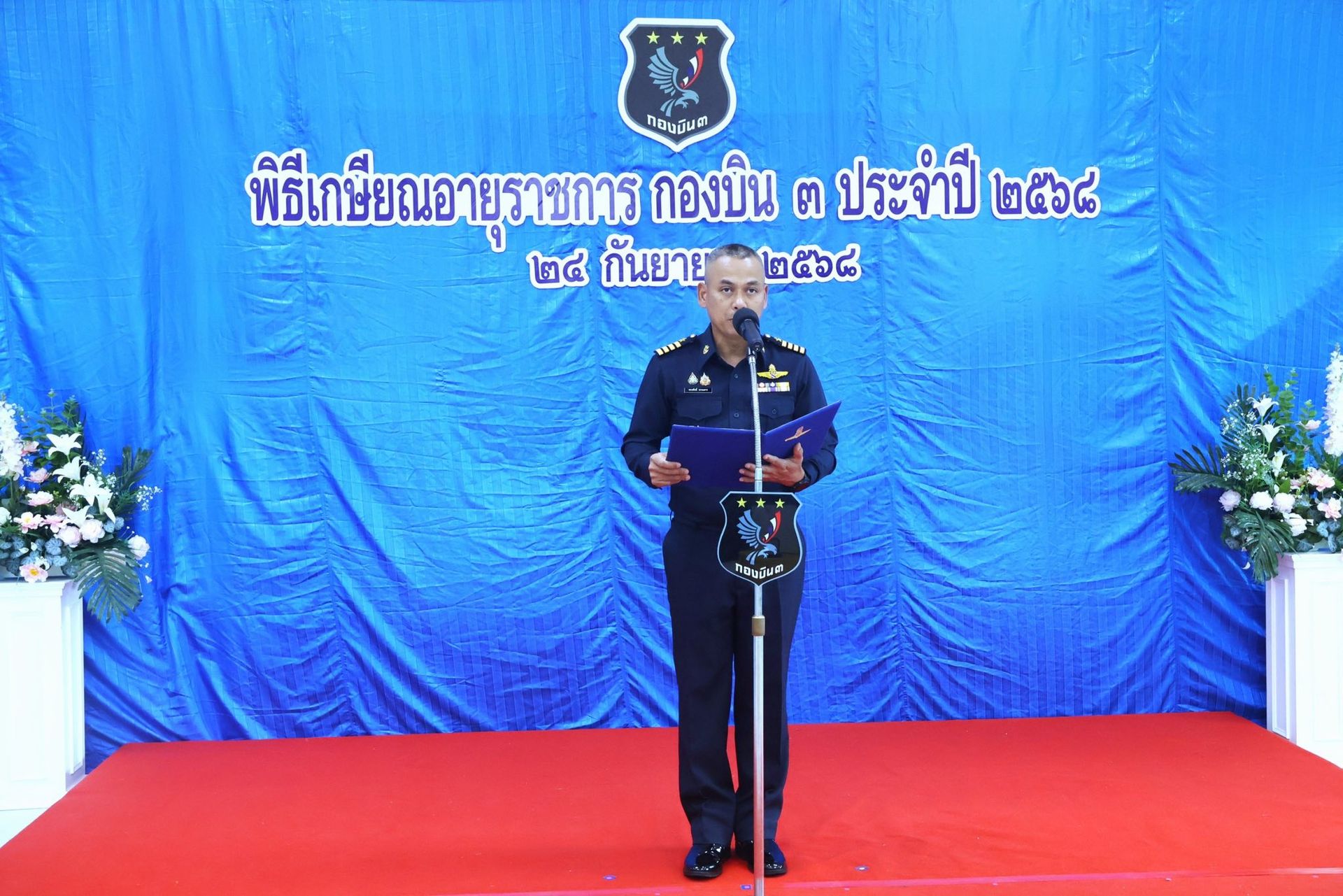 เมื่อวันที่ ๒๔ กันยายน ๒๕๖๘ ณ กองบิน ๓ นาวาอากาศเอก ทรงศักดิ์ ธรรมสาร ผู้บังคับการกองบิน ๓ เป็นประธานในพิธีเกษียณอายุราชการ ประจำปี ๒๕๖๘ โดยมี ข้าราชการกองบิน ๓ เข้าร่วมกิจกรรมอย่างพร้อมเพรียง ภายในพิธีมีการอ่านสารแสดงความรู้สึกจากผู้บัญชาการทหารอากาศ ต่อผู้ที่ปฏิบัติหน้าที่ราชการจนครบเกษียณ ซึ่งเป็นผู้ที่ได้อุทิศตน เสียสละแรงกาย แรงใจ และความรู้ความสามารถในการรับใช้กองทัพอากาศและประเทศชาติด้วยความวิริยะอุตสาหะ สมควรได้รับการยกย่องเชิดชูเกียรติโอกาสนี้ประธานในพิธีได้มอบโล่เกียรติคุณและของที่ระลึก แก่ผู้เกษียณอายุราชการ เพื่อเป็นเครื่องหมายแห่งความภาคภูมิใจ และเพื่อเป็นขวัญกำลังใจ พิธีเกษียณอายุราชการครั้งนี้ เป็นการแสดงออกถึงความกตัญญูกตเวที และการยกย่องเชิดชูเกียรติแก่ผู้ปฏิบัติหน้าที่ด้วยความซื่อสัตย์ สุจริต และเสียสละ อันจะเป็นแบบอย่างที่ดีแก่กำลังพลรุ่นต่อไปของกองทัพอากาศสืบไป#กองทัพอากาศ#กองบิน3