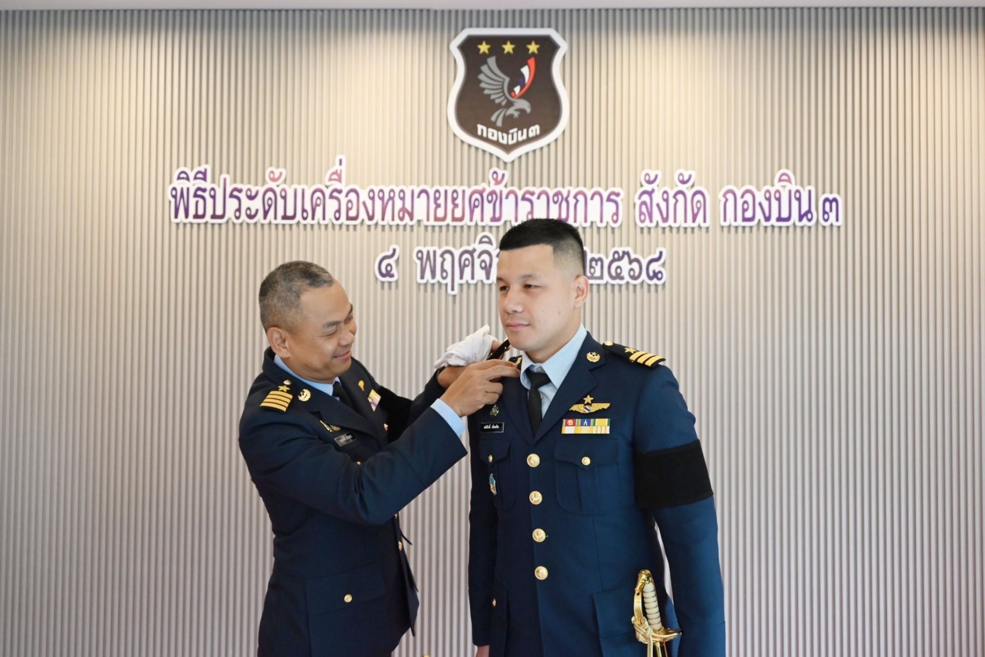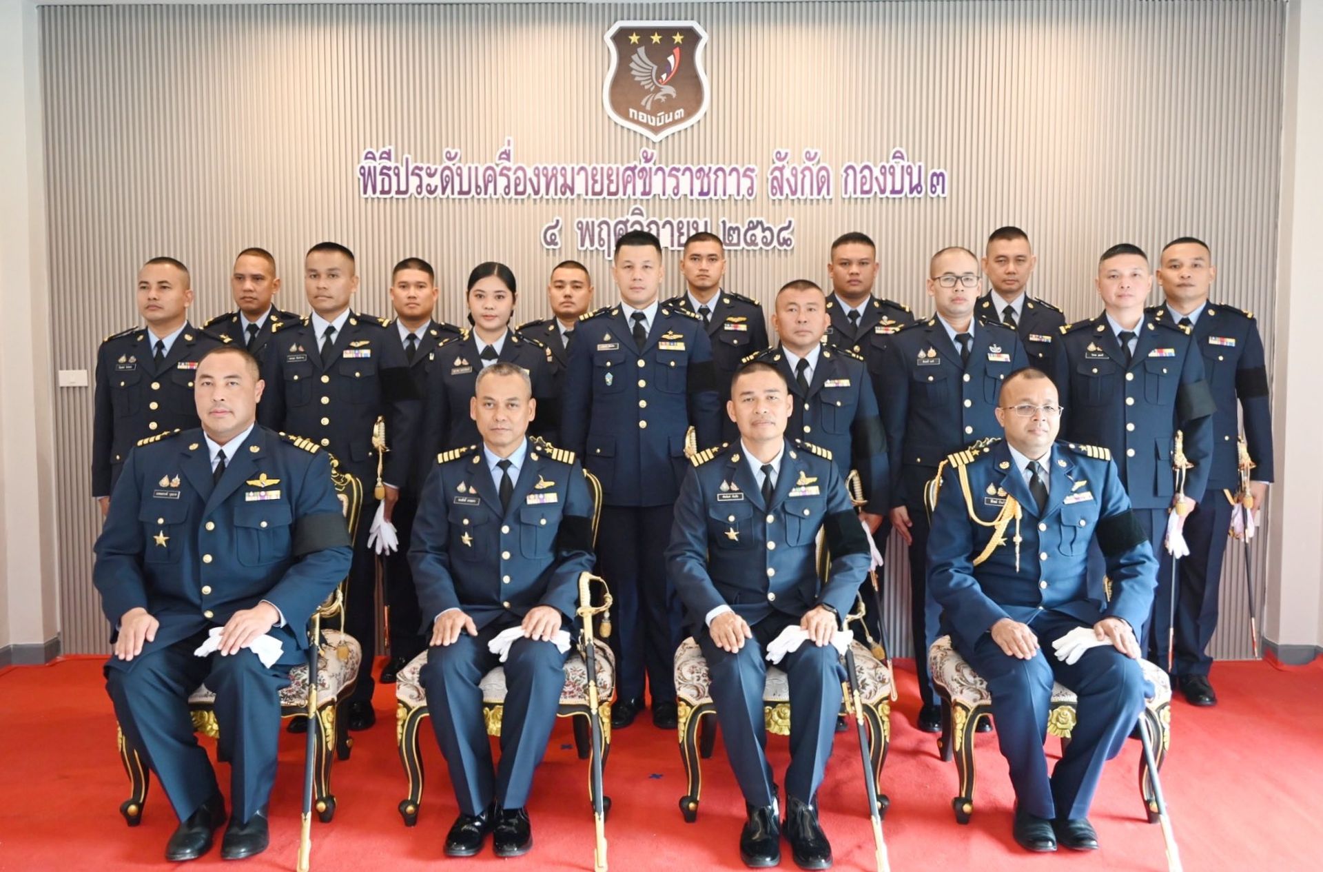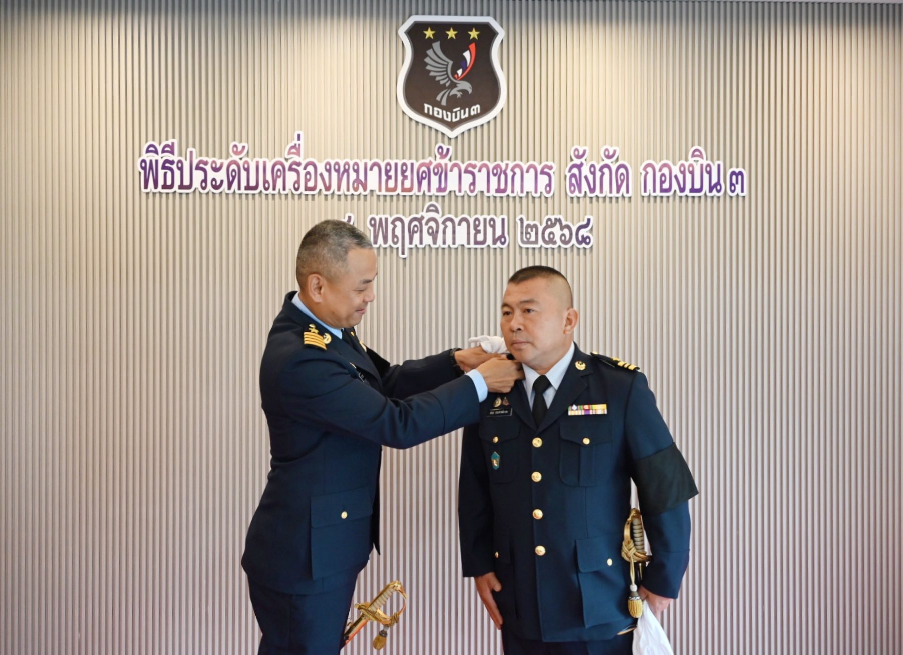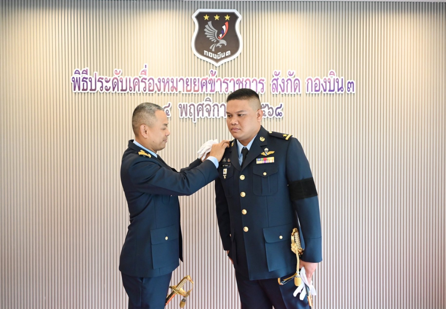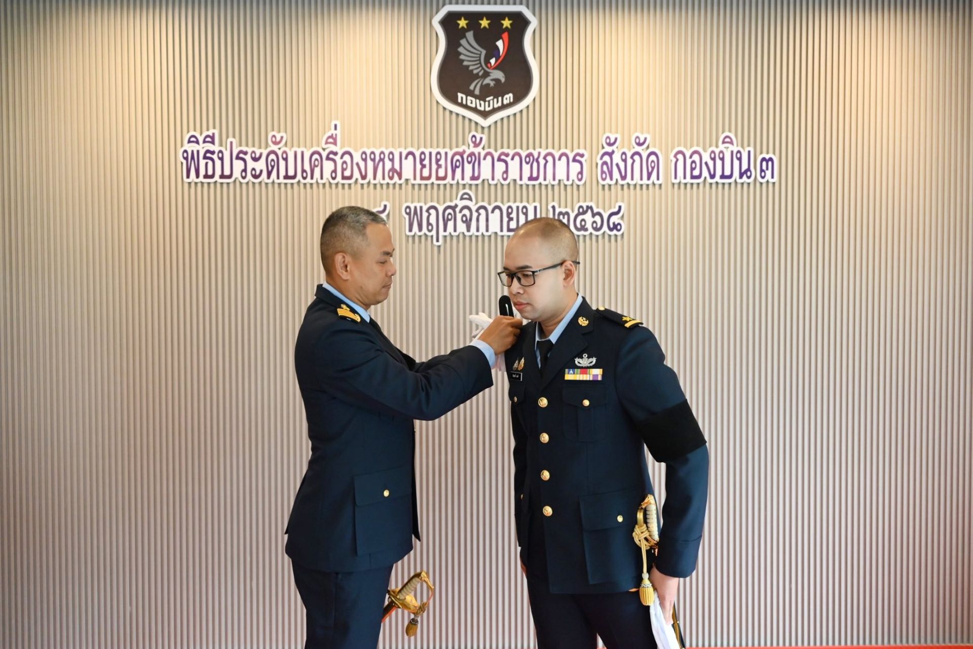 เมื่อวันที่ ๔ พฤศจิกายน ๒๕๖๘ ณ อาคารฝึกอบรม ศูนย์การฝึกอากาศยานไร้คนขับกองทัพอากาศ (RTAF-UTC) นาวาอากาศเอก ทรงศักดิ์ ธรรมสาร ผู้บังคับการกองบิน ๓ เป็นประธานในพิธีประดับเครื่องหมายยศนายทหารชั้นสัญญาบัตร และนายทหารชั้นประทวน สังกัดกองบิน ๓ ที่ได้รับการเลื่อนยศสูงขึ้น โดยมี รองผู้บังคับการกองบิน ๓, เสนาธิการกองบิน ๓, หัวหน้าหน่วยขึ้นตรง กองบิน ๓, ข้าราชการ กองบิน ๓ และครอบครัว ร่วมเป็นเกียรติ และแสดงความยินดีกับผู้เข้ารับการประดับเครื่องหมายยศ ในครั้งนี้#กองทัพอากาศ#กองบิน3