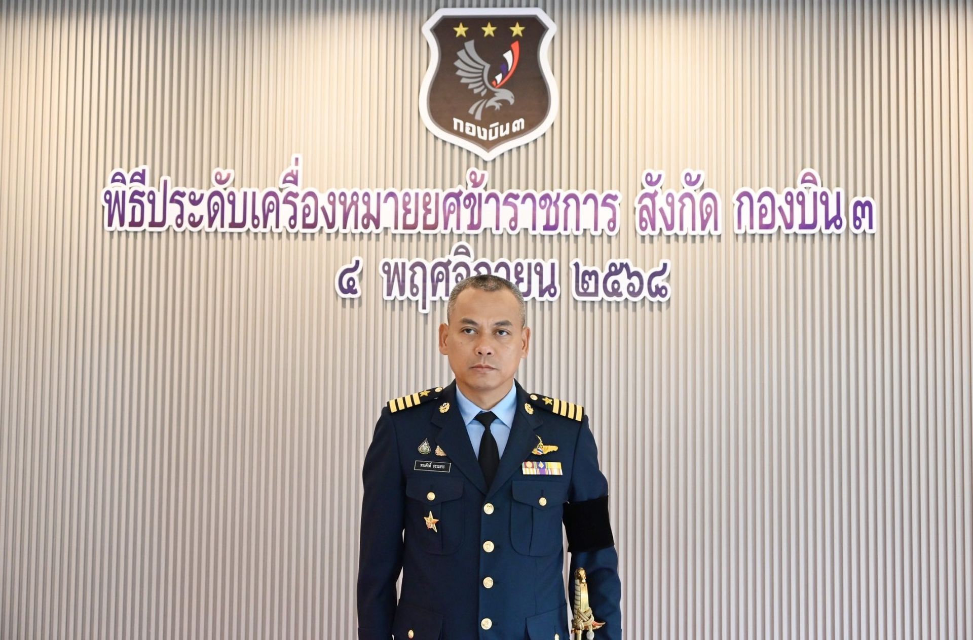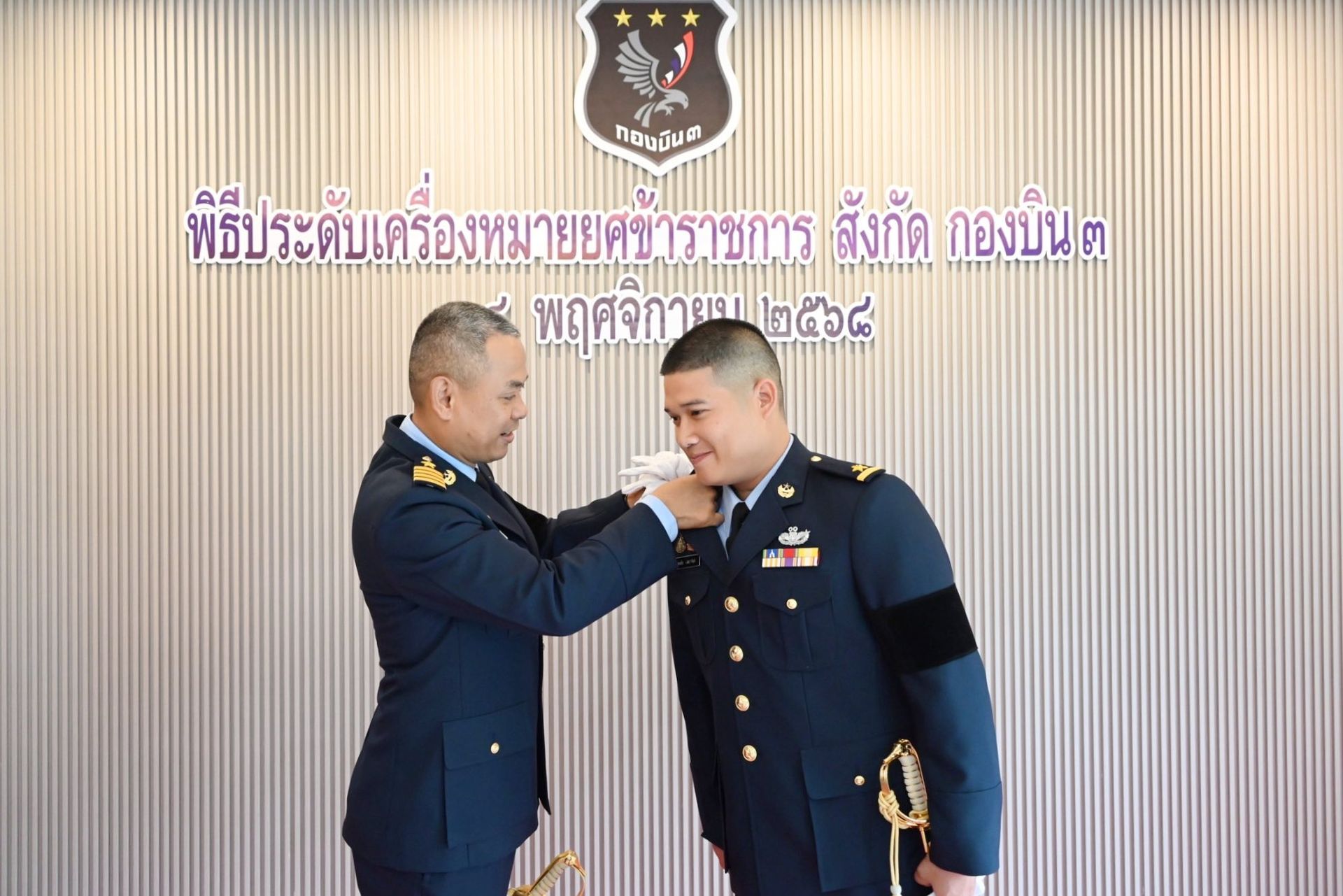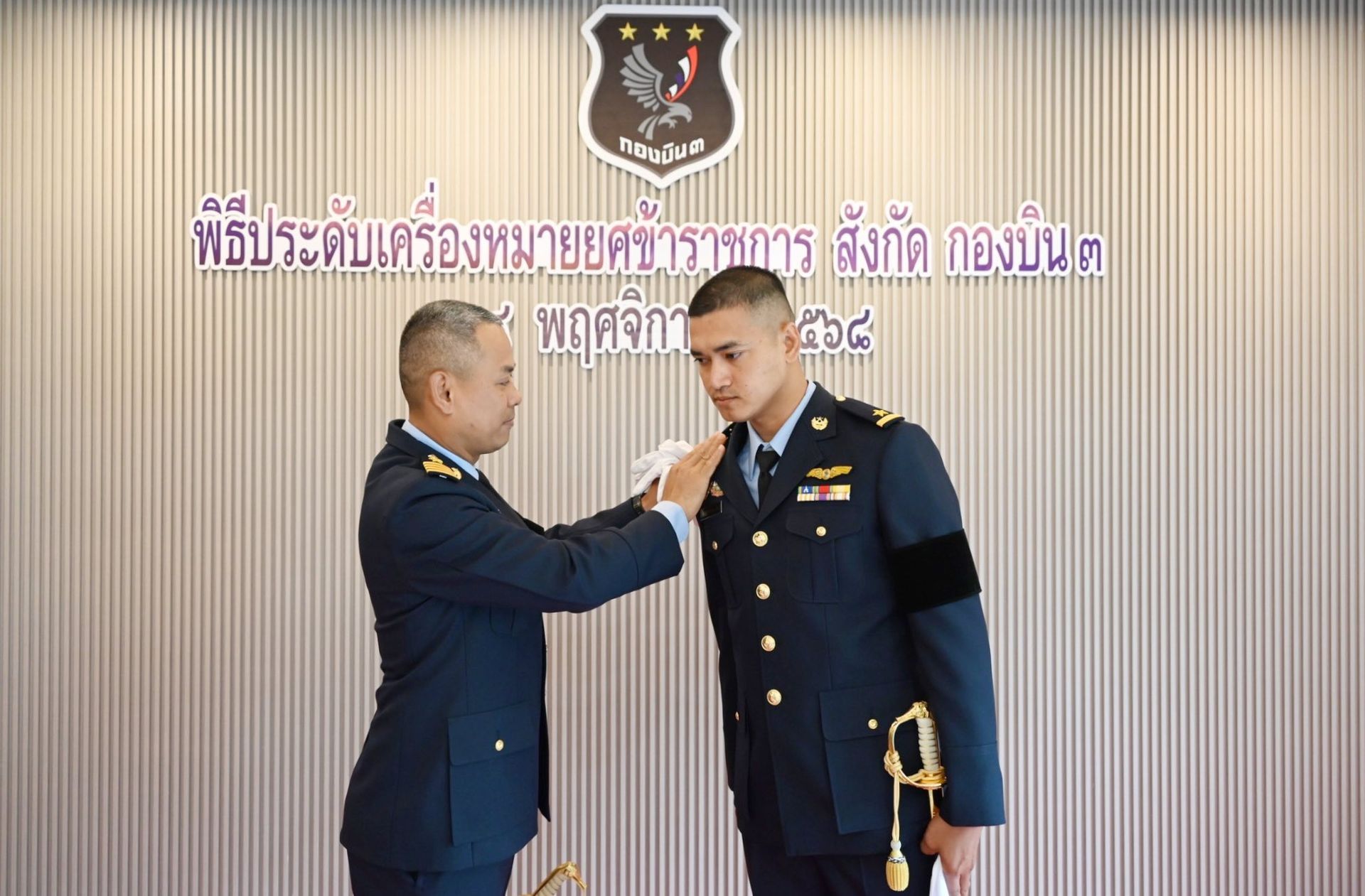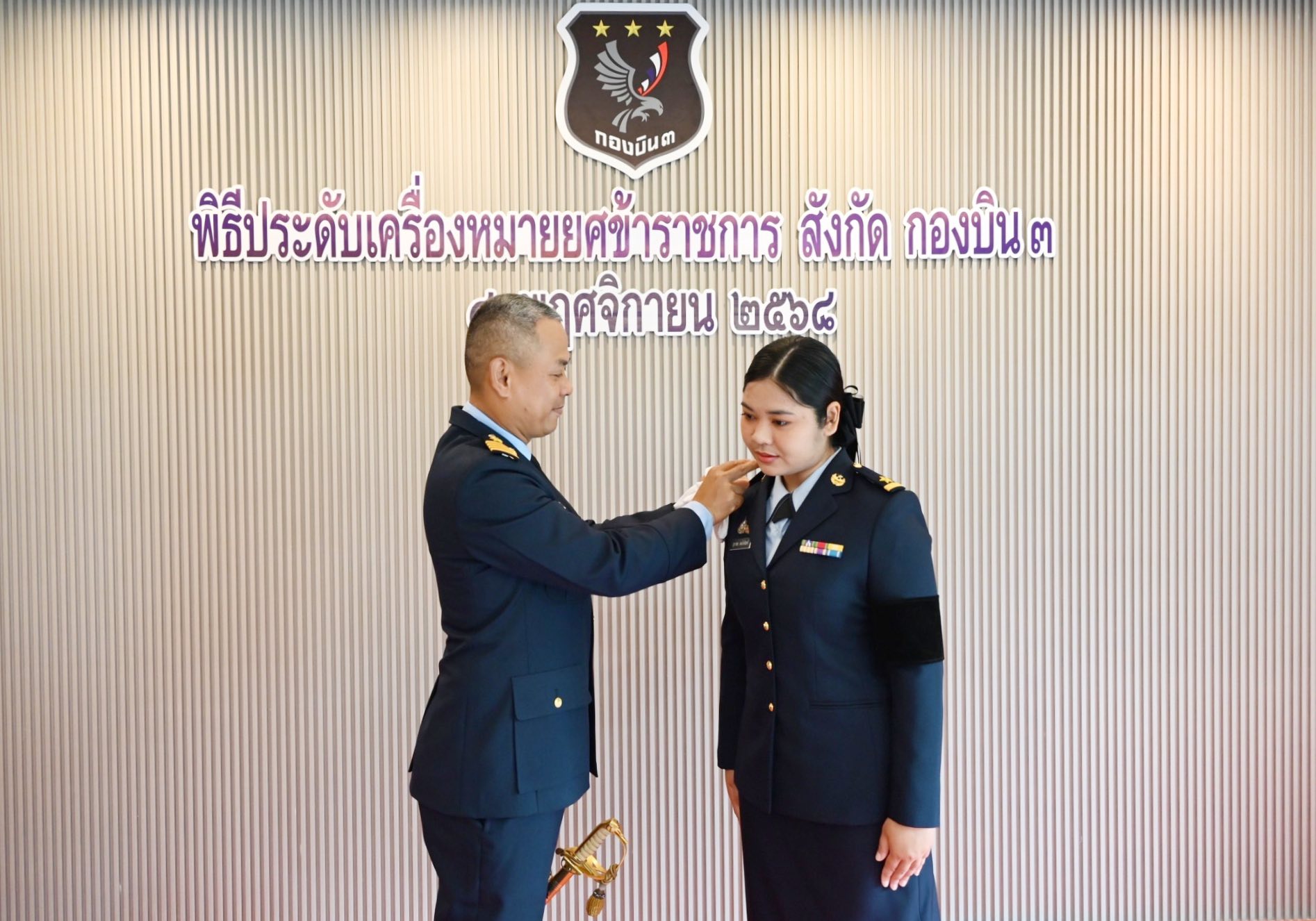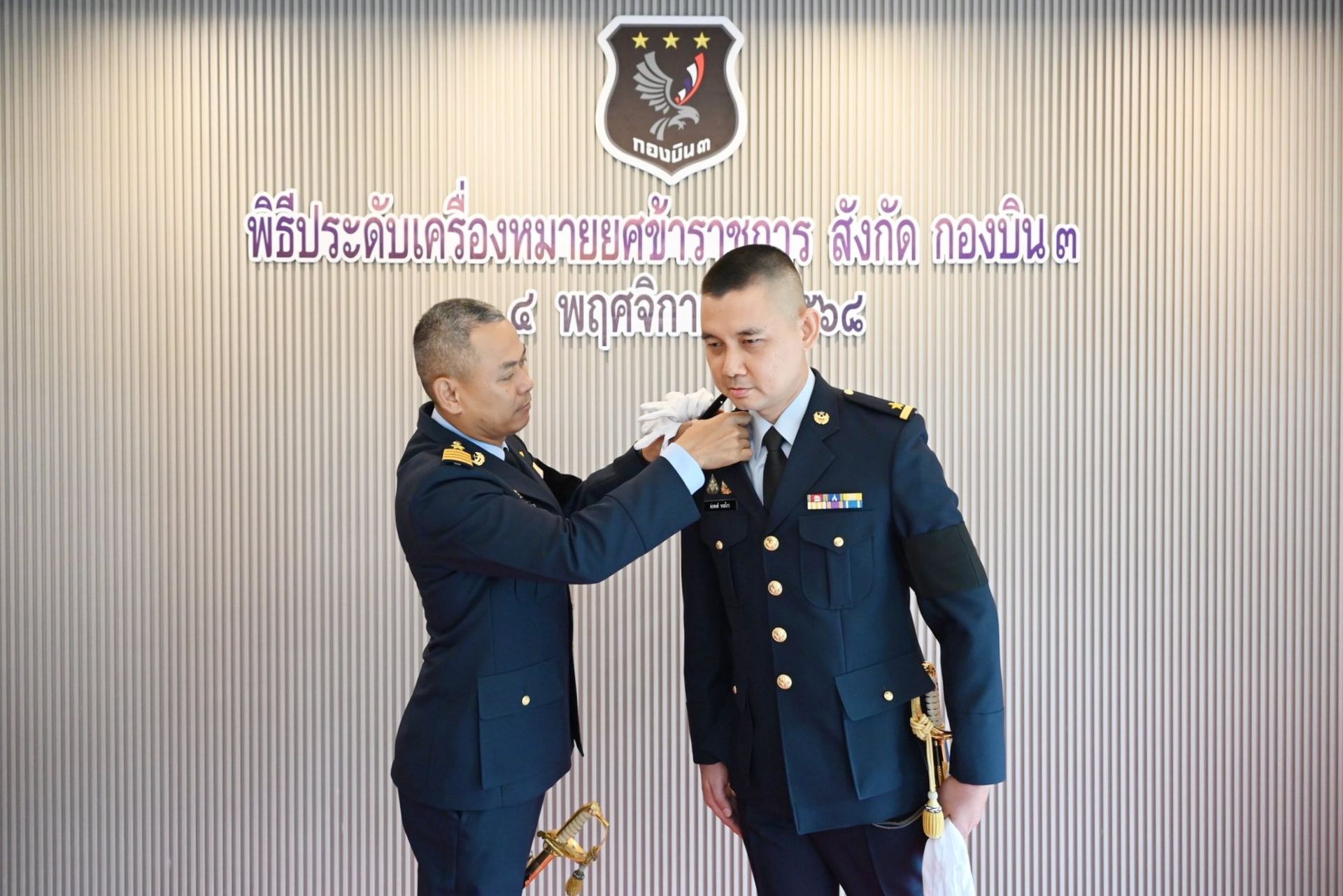 เมื่อวันที่ ๔ พฤศจิกายน ๒๕๖๘ ณ อาคารฝึกอบรม ศูนย์การฝึกอากาศยานไร้คนขับกองทัพอากาศ (RTAF-UTC) นาวาอากาศเอก ทรงศักดิ์ ธรรมสาร ผู้บังคับการกองบิน ๓ เป็นประธานในพิธีประดับเครื่องหมายยศนายทหารชั้นสัญญาบัตร และนายทหารชั้นประทวน สังกัดกองบิน ๓ ที่ได้รับการเลื่อนยศสูงขึ้น โดยมี รองผู้บังคับการกองบิน ๓, เสนาธิการกองบิน ๓, หัวหน้าหน่วยขึ้นตรง กองบิน ๓, ข้าราชการ กองบิน ๓ และครอบครัว ร่วมเป็นเกียรติ และแสดงความยินดีกับผู้เข้ารับการประดับเครื่องหมายยศ ในครั้งนี้#กองทัพอากาศ#กองบิน3